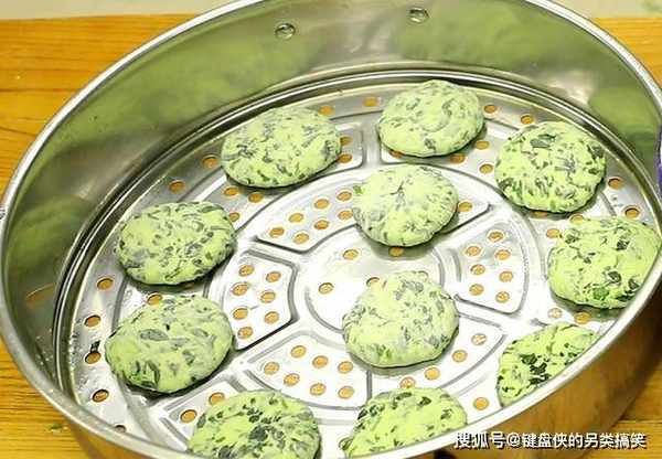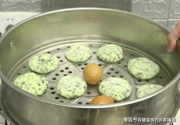 3.篦子上刷上一层油防止粘连,把饼坯一个一个放进去,中间稍微留点缝隙,防止蒸熟以后粘在一起,再放入两个鸡蛋,等会用来调酱用,水烧开以后大火蒸15分钟即可。