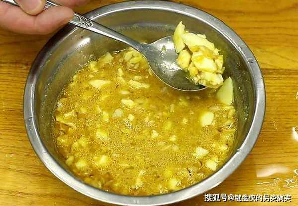 4.15分钟以后把饼坯取出,把鸡蛋剥去外皮放入蒜臼中,加入适量的大蒜,捣碎。