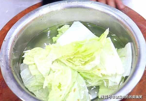2.准备白菜叶几片,把菜帮和菜叶分开,分别用清水洗干净,菜叶切成大片,菜帮切成长条。