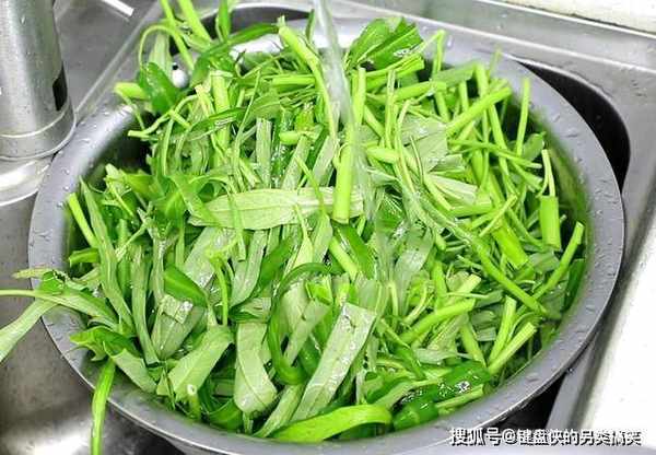 2.锅内烧油,把油充分烧热,放入空心菜的同时加入半勺淡盐水,转大火快速翻炒出锅气,这一步是给空心菜入底味的同时补充一部分水分,大概炒20秒钟,空心菜返青以后立即出锅。