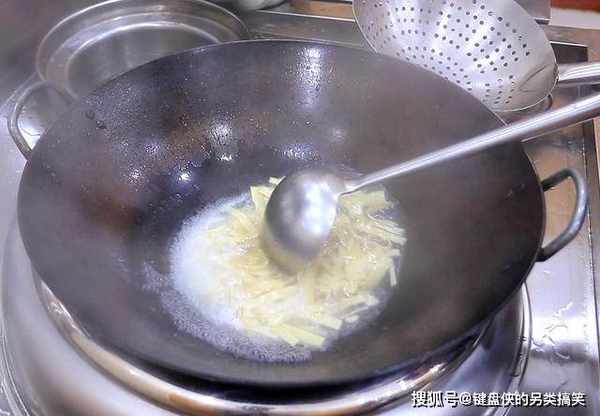 4.锅内多烧一些油,凉油放入洋葱、葱丝,凉油下锅更容易炸出香味,开小火慢慢炸,经常搅动让葱丝均匀受热。