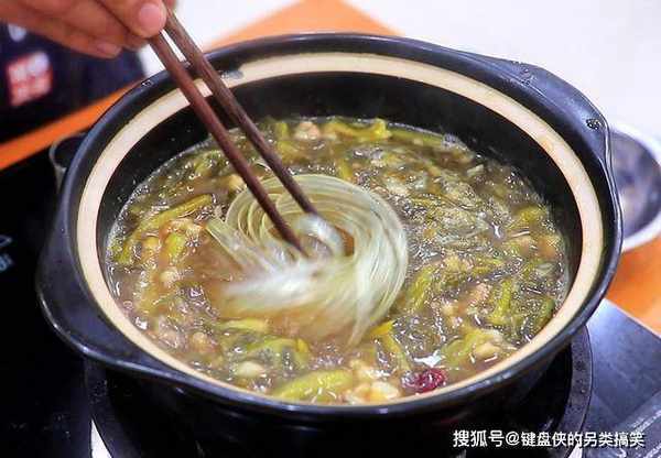 6.酸菜炒干、炒香以后倒入适量的清水,加入食盐2克,胡椒粉2克,老抽3克,汤汁沸腾以后起锅,连汤带菜一起倒入砂锅中,放入准备好的宽粉,大火烧开以后盖上锅盖,转小火炖10分钟,把宽粉焖熟让其吸收汤汁入味。