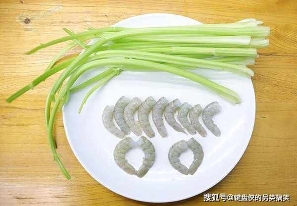 1.准备一把西芹,清洗干净,斜刀切成段备用;适量的虾仁,把虾背划开去除里面的虾线,清洗干净备用;再切点洋葱片、葱片放在一起,用来炸葱油。