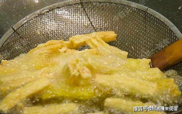 不要一下全倒进去 ,容易粘一块。轻轻的搅搅 ,受热更均匀。约摸着炸一分钟,腐竹炸的黄兰兰的焦溜溜的就管捞出来了。