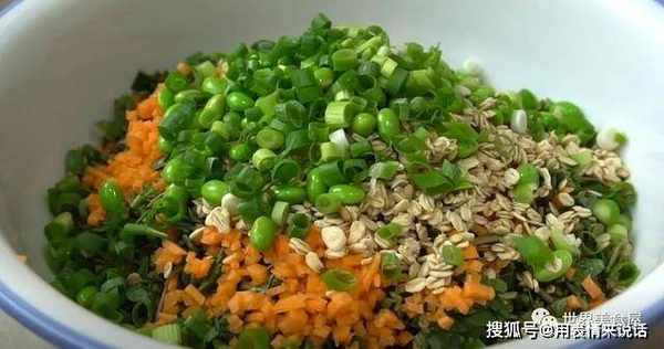 2、接着准备一些胡萝卜和葱花,同样切碎,放在马齿苋中。家里有燕麦、青豆的话,可以放点进去,没有可以不放。