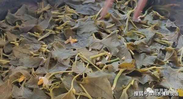 3、蒸熟的鱼腥草,变成了灰黄色,大家常见的鱼腥草只是根部,其实它的叶子也可以吃。