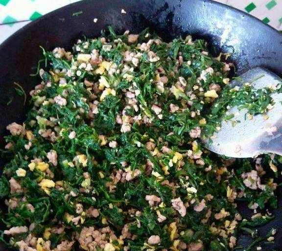 4.倒入炒好的鸡蛋和切好的荠菜,翻炒均匀,加入胡椒粉和香油调味,盛盘放凉~
