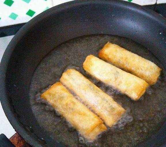 8、锅里放油,尽量多放些,烧热,放入春卷,因为皮薄,中火炸一分钟左右差不多就脆了,沥油盛盘~