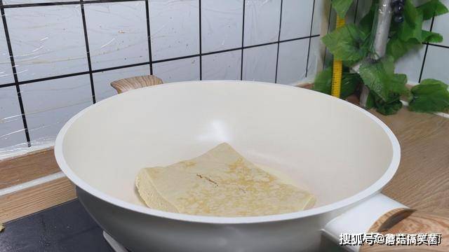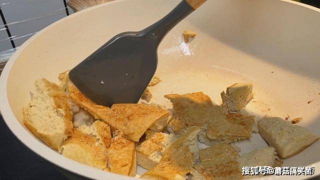 5、起锅烧油,加入比平时炒菜多一点的油,把挤干水分的豆腐,放进去,把豆腐煎至一下,把豆腐煎到外皮焦焦的,才更好吃,煎至到豆腐一面金黄后,翻面煎至另一面,翻面的时候,可以借助铲子和夹子,这样豆腐不会碎,把另一面,也煎制到金黄。