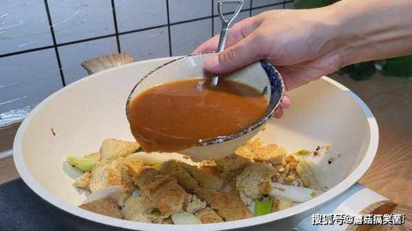 8、接着,倒入我们调好的料汁,用小铲子翻炒一下,煎制过的豆腐,不会那么容易的碎,然后小火炖上两分钟。