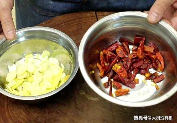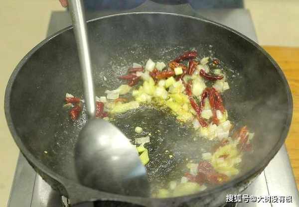 4.锅热烧油,爆炒类的菜最好是用明火炒,锅气才能上得来,把葱姜蒜倒进去爆香,接着放干辣椒,充分炒香爆出糊辣味吃着才对劲,沿锅边烹进去半勺醋。