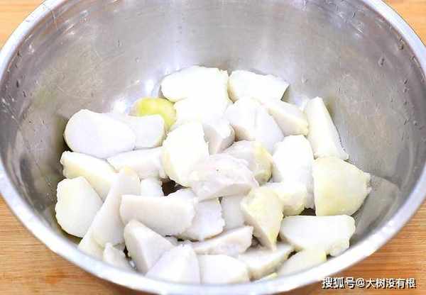 1.把芋头上面的泥土刷洗干净,放入高压锅中,加入适量的清水,大火烧至上汽以后关火,让它自然冷却。气压阀降下来以后,把芋头倒出来过一下凉水,剥掉外皮,切成均匀的滚刀块备用。