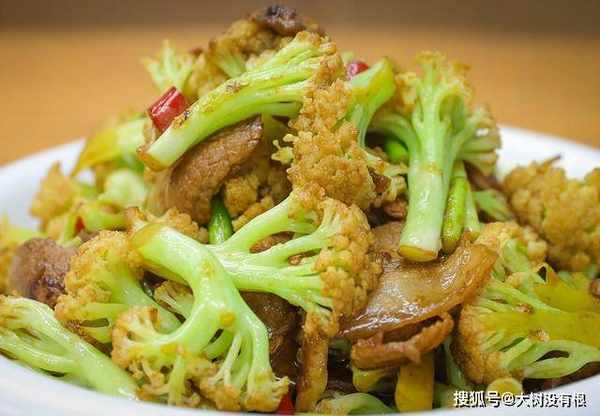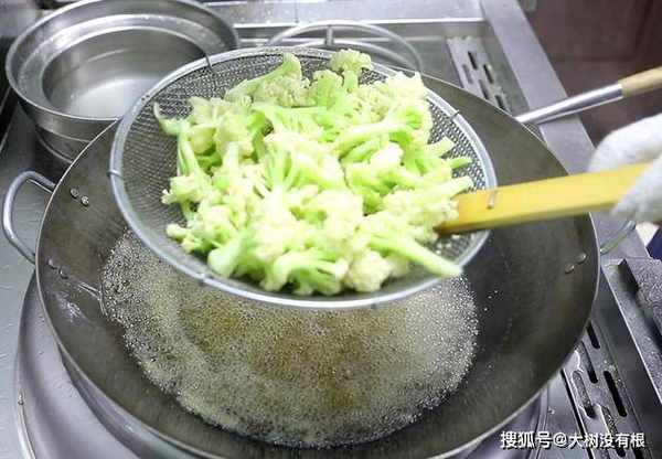 3.锅内加入植物油,把油温烧至四成热,倒入花菜快速滑油5秒钟,立即捞出控油,滑油是为了让花菜快速成熟的同时保留鲜脆感,花菜滑油是饭店的常规操作,家庭可以尝试操作。