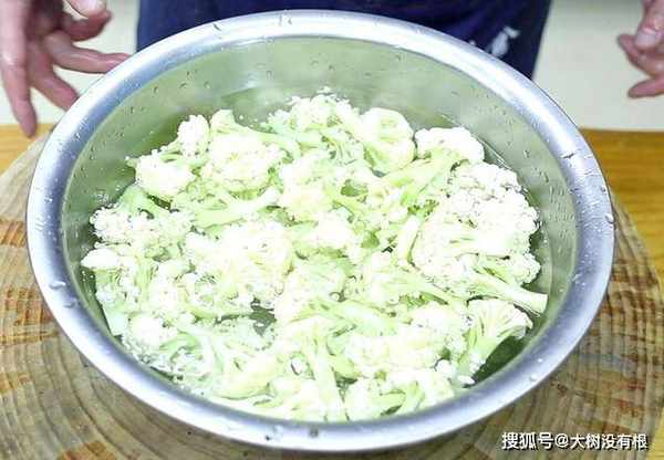 1.准备一朵花菜,顺着根茎拆开切成小朵,清水中加入食盐,把切好的花菜放进去浸泡几分钟,用淡盐水浸泡能很好地杀菌去除异物,泡好以后清洗干净。