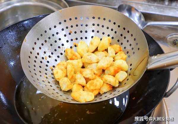 3.锅内烧油,趁着加热的时间,在芋头上撒一层淀粉,待油温升至5成热时倒入芋头,开小火慢慢炸,芋头定型以后,用勺子轻轻地推动,让它均匀受热,大约炸2分钟,芋头炸成金黄色,非常焦酥时捞出来控油。