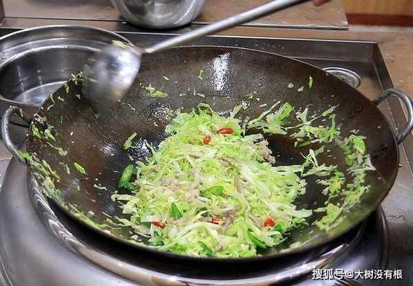 3.锅内烧油,充分滑锅以后,倒出热油加入凉油,热锅冷油防止肉丝粘锅,把肉丝倒入锅中,煸炒出里面的油脂,把肉丝炒香、炒变色,倒入蒜末和青红椒翻炒出蒜香味,倒入包菜,转大火快速颠锅翻炒1分钟。