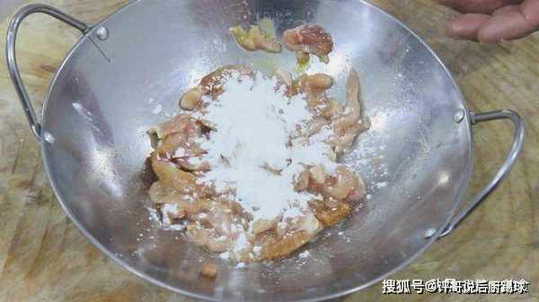 6.接着放入淀粉,搅拌后,再滴入几滴植物油抓匀。(目的:为了锁住肉丝水分,让肉丝保持鲜嫩,然后在炸的过程中不容易粘连。)