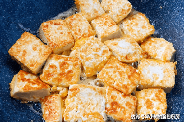 1、准备3块钱的豆腐,改刀切成四方块,起锅烧油,豆腐裹一层鸡蛋液,下锅煎一煎,煎至色泽金黄捞出。