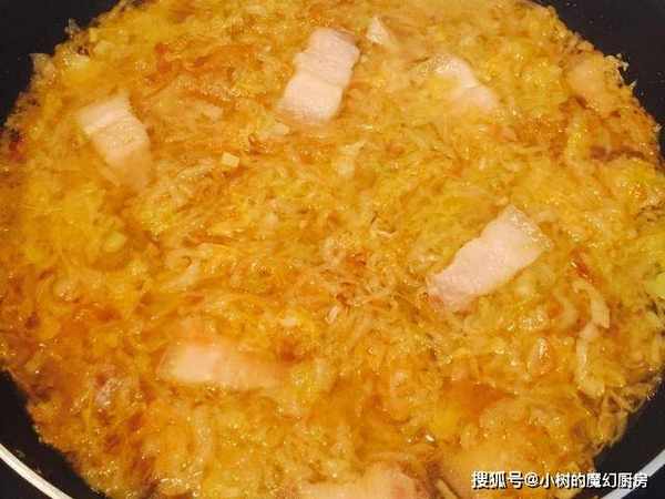 2、酸菜提前冲洗一遍,攥干水分,放入五花肉中一起煸炒,调味放