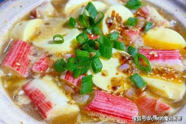 3、临出锅的时候,放入适量的香菜、葱花点缀一下,就可以开吃了,蟹棒很容易熟透的,不用煮太久,这道砂锅菜很适合当夜宵,