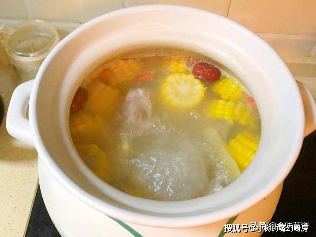 3、另外准备一个砂锅,把排骨倒进来,加入足量的开水,大火煮开转小火,慢炖半个小时,接着加入玉米、胡萝卜、红枣和枸杞,再炖半个小时。