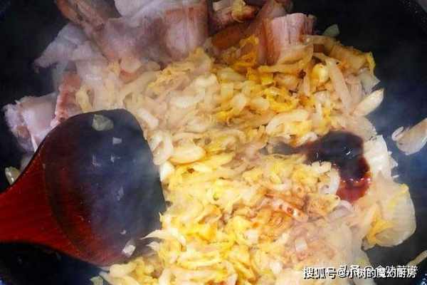 捞出改刀切片,薄厚一致,起锅烧油,油热放葱姜末、花椒爆香,接着倒入五花肉,用中小火煸炒出肥油。