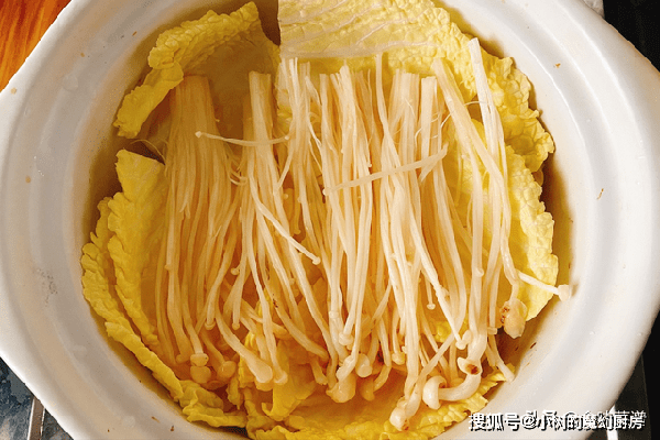 2、把砂锅准备好,最底部铺一层白菜叶,上面放金针菇,喜欢上面食材放什么。
