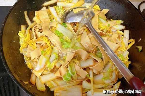 2、接着倒入白菜、干豆腐一起翻炒,调味品放食盐、生抽、老抽和蚝油,翻炒一会儿,炒软之后倒入开水,放干豆腐和粉条,大火烧开转小火,慢炖半个小时,等时间到了,放适量的鸡精,即可出锅。