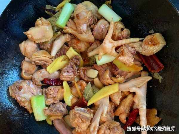 2、起锅烧油,油热倒入葱、姜、辣椒、八角、桂皮,接着倒入鸡块翻炒几下。
