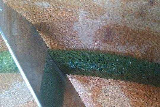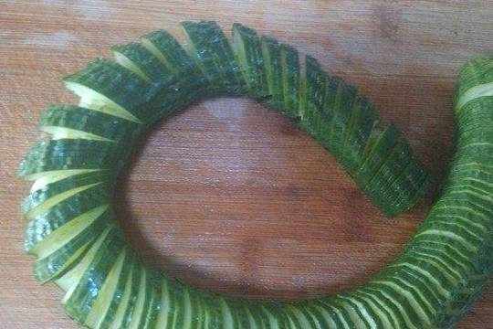3.翻一面,刀与黄瓜成90度切,不要切断