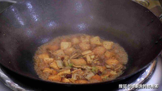 5.3分钟以后转大火收汁,汤汁快收干的时候,加入一点蚝油增鲜,再勾入一点水淀粉,让汤汁裹在豆腐表面,再淋入一点明油提亮色泽,即可出锅装盘最后撒上葱花美味即成。