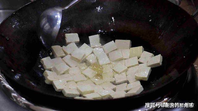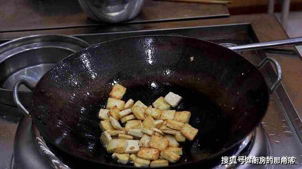 2.食材全部准备好以后,我们开始煎豆腐,锅内烧油,充分滑锅以后,倒出热油加入凉油,热锅凉油能防止煎豆腐时粘锅,把豆腐片倒入锅中,用勺子把叠在一起的推散。