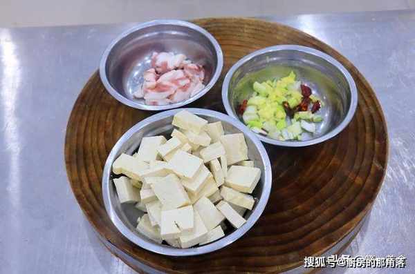 1.首先,我们准备一块老豆腐,切成一厘米左右的豆腐片,最好的选择老豆腐来煎,老豆腐比较紧实不容易煎碎。五花肉一小块切成薄片,大葱破开切成葱花,生姜切成小粒,再抓入几粒干辣椒备用。