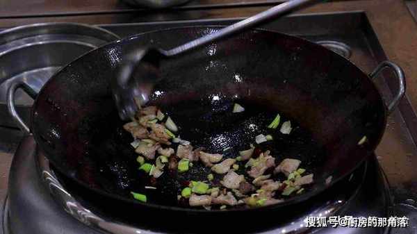 3.锅内留少许底油,把肉片放入锅中进行煸炒,炒出里面的肥油,肉片炒香以后,把葱姜干辣椒倒入锅中继续翻炒,炒出葱香味。