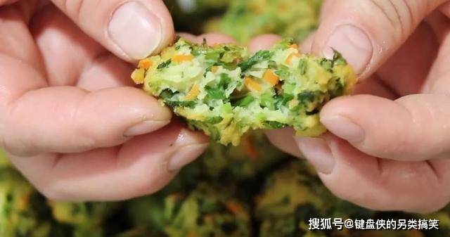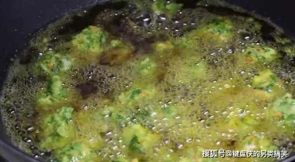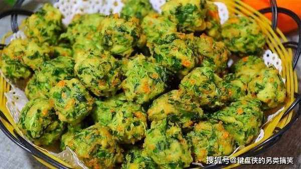 13.抓起一把菜糊,用虎口挤出一个个丸子,挤好的丸子直接放入油锅里面开小火慢炸。
