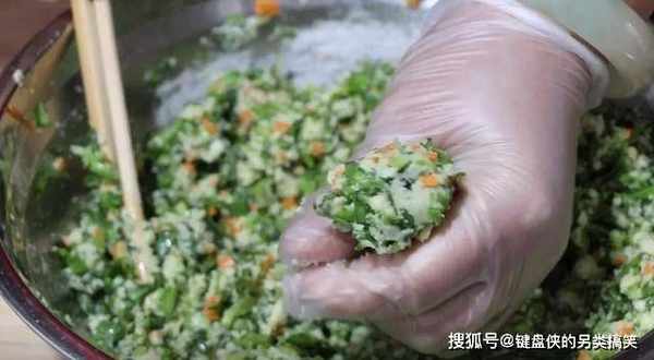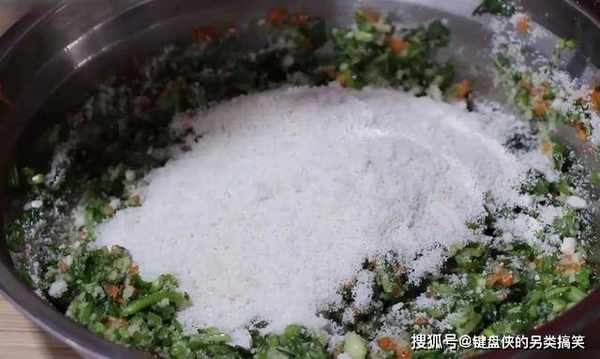 10.接着少量多次往里倒入馒头糠,一边加一边搅拌,使蔬菜完全被面包糠包裹。