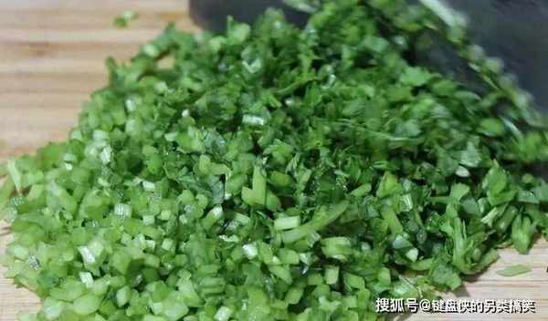 5.接着将洗净后的茼蒿放案板上,用刀切碎末。