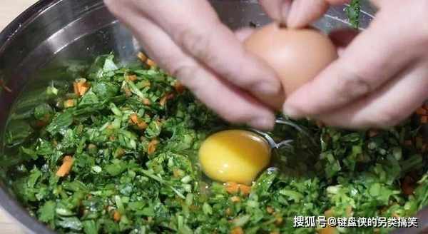 9.茼蒿腌制好之后,打入2个鸡蛋,用筷子搅拌均匀。