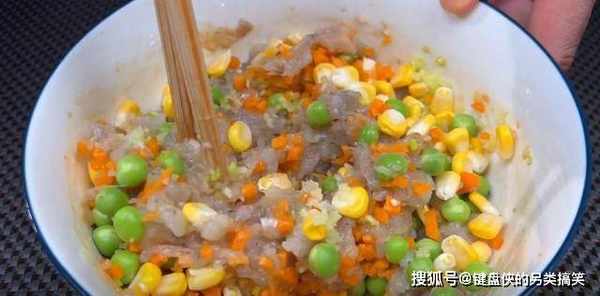 6.再加入胡萝卜丁、青豆粒、玉米粒,既能丰富口感,又能使食材颜色更加鲜艳漂亮,搅拌均匀备用。
