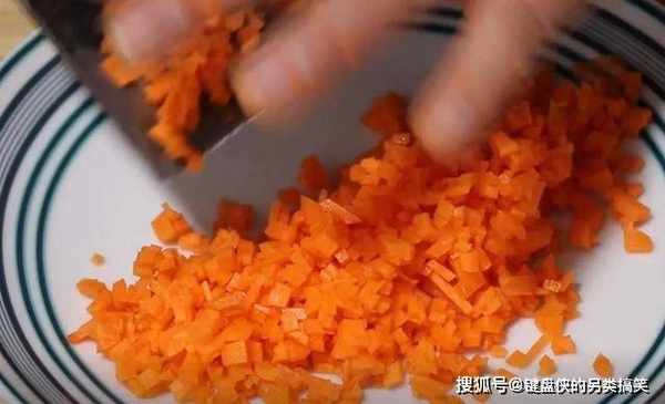 3.胡萝卜切片,再切丝,最后切成胡萝卜末,切好备用。