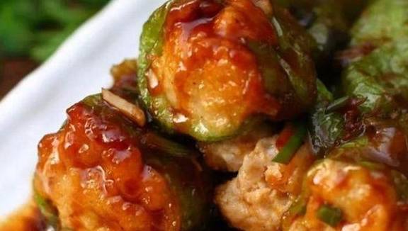 1、葱切花,蒜切片,猪瘦肉切成肉末,加入适量料酒和盐搅拌均匀。青尖椒去蒂掏空。将调好的肉馅塞满青尖椒里,最后蘸上一层淀粉备用;