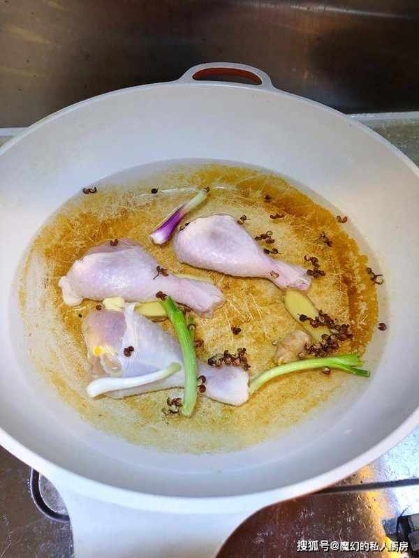 处理鸡腿,冷水下锅,将鸡腿、葱段和花椒都放到锅里,大火沸腾煮开,转中火再煮十分钟左右。