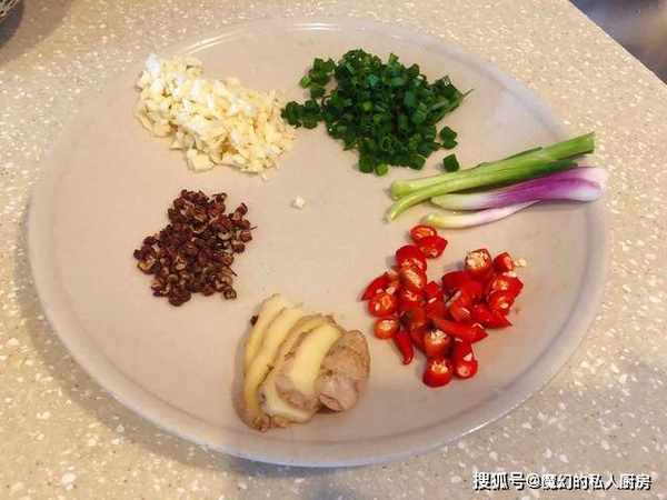 将姜,葱切段,小米辣切成小段,蒜切末,放在盘中,待会用的上。
