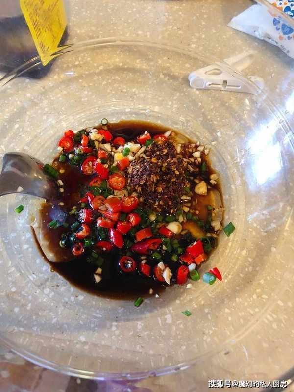 :蒜末、小米辣、葱末,再加酱油、醋、适量白糖、盐、辣椒油、花椒油和芝麻油。