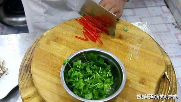 准备香菜一把,随便切上几刀,用香菜是为了增色提味,红椒半个切成细丝,用来配色。