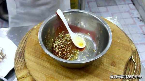 3.把切好的蒜末放在盆里,加入食盐,白糖,加入陈醋,增强回味,加入芝麻油,增强香醇感,加入辣鲜露,提鲜提辣,没有辣鲜露的,可以用辣椒油代替。
