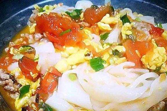 西红柿2个、鸡蛋3颗、肉末300克、小香葱1把、宽面条500克、盐半茶匙、糖少许