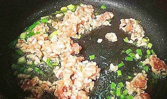 3、锅内留底油放入葱花(有些人不喜欢葱花可以不放),倒入肉末煸炒直至变色,放糖,倒入西红柿块,煸炒一会,撒盐,用铲子感觉西红柿变得软烂,慢慢渗出红油;