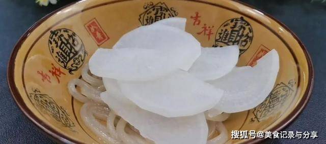 7.准备半个白萝卜,削皮后切成薄片,羊肉切成薄片备用。