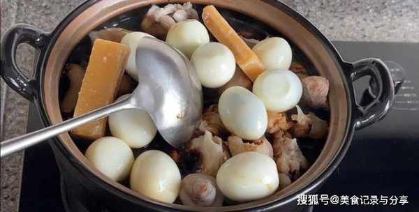 6.再加10个剥壳的水煮蛋,两片糖,盖上盖子大火煮开,转小火慢炖一个半小时。